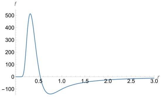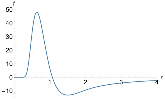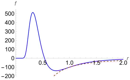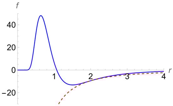 For illustrating the perfect match in more detail, we provide Figure 8 showing, by the solid line, fint(r) from Equation (36) and, by the dashed line, fext(r) from Equation (38). It is seen that at R = 2, there is a smooth transition from the solid line to the dashed line.
