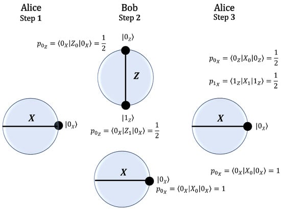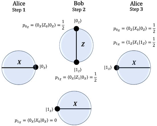 If the state remains unchanged, Alice cannot determine Bob’s basis choice. However, if the measurement result is orthogonal to the originally prepared state (), this indicates that Bob used a basis different from Alice’s preparation basis, allowing her to infer Bob’s choice.