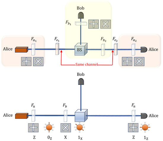 Figure 3. This reduction arises from the fact that Bob either measures the incoming pulse in a chosen basis or polarizes it before retransmission, but he cannot perform both operations simultaneously. Consequently, a single polarizer suffices to fulfill both functions. Similarly, for Alice, the polarizer