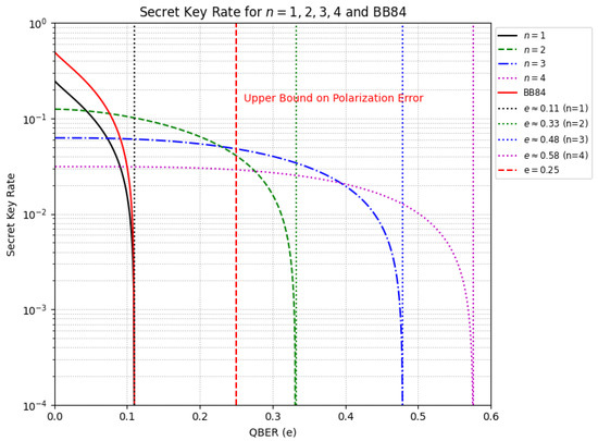 Thus, as n grows, e asymptotically approaches 1. However, this advantage comes at the cost of a reduced initial secret key rate, which declines from to . Therefore, while the protocol becomes more resilient to errors, it experiences a lower key generation rate.