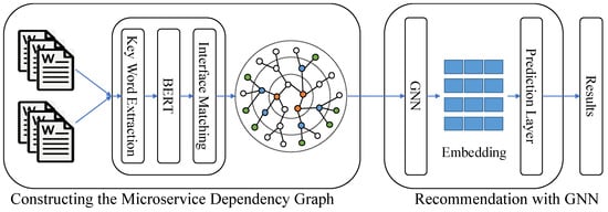Our IM-GNN model can be divided into two main parts, with a total of four modules. The first part focuses on constructing the microservice dependency graph based on the interface matching method, while the second part aims to build a graph neural network on the already constructed microservice dependency graph to recommend microservice orchestration. The model structure is shown in Figure 1.