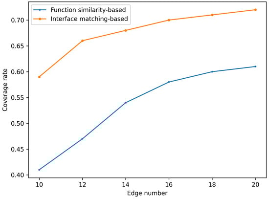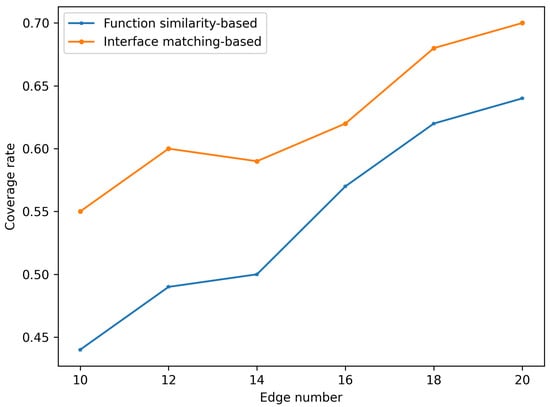 To ensure a relatively fair comparison, the number of edges in the graphs constructed for this experiment is kept consistent. The analysis shows that when the number of edges in the graph is small, the coverage of the interface matching-based method significantly outperforms the functional similarity-based method. As the number of edges increases, the coverage of both methods rises and then stabilizes. On both the SageMaker and Comprehend datasets, the coverage of the microservice dependency graph constructed using the interface matching method is clearly superior to that of the graph constructed based on microservice functional similarity.