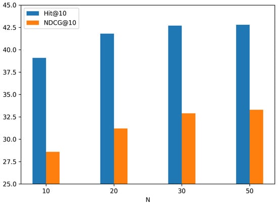 To accurately evaluate the performance of the model created in this paper, two different evaluation metrics, and the normalized discounted cumulative gain () [25], are used. These two metrics provide a relatively comprehensive assessment of the model’s recommendation performance. In recommendation tasks, represents the hit rate of recommendations. As a metric, helps the system discover more useful information and improve the quality of the recommendation results. Here, K represents the top K items in the recommendation list. The algorithm accumulates all the hit rates and then divides by the total number of users to obtain the value. When the value of is high, it indicates that the recommendation list contains more content that the user needs, thus the model’s recommendation accuracy is higher. Conversely, if the value is lower, it indicates that there is less content that the user needs in the recommendation list, resulting in lower recommendation accuracy. The specific formula for is the following:
