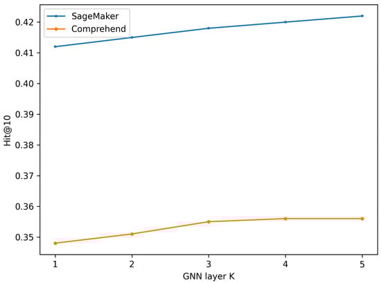 In order to allow the model to better learn information from higher-order neighbors, this paper introduces a multi-layer graph neural network to integrate information from higher-order neighboring nodes, which increases the richness of node information. It is important to note that the number of network layers K is a hyperparameter, and therefore needs to be determined through experiments. From a theoretical perspective, the higher the K value, the richer the node data collected by the model. We set and conducted experiments on the SageMaker and Comprehend datasets based on different network layer numbers. The experimental results are shown in Figure 6.