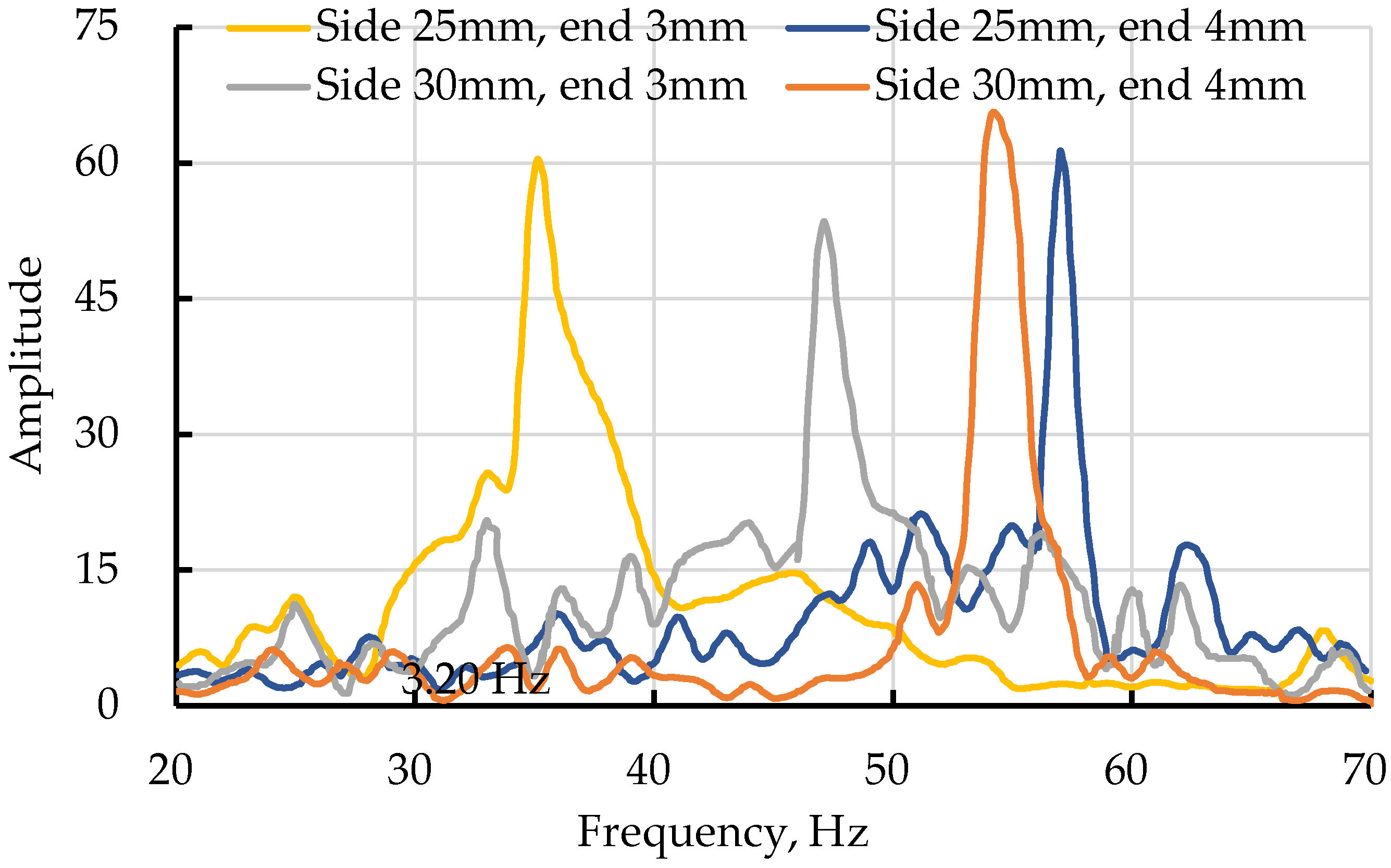 Figure 13. The vortex frequency curve of the vortex generator with the curvature radius of the concave arc of 25 mm and 30 mm and the fillet radius at the end of 3 mm and 4 mm.
