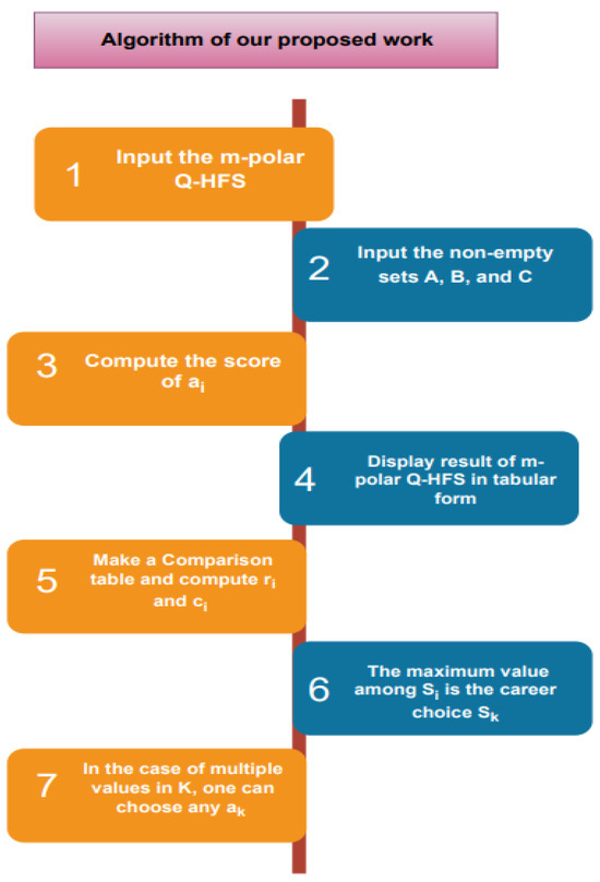 We provide a procedure based on sets of . Algorithm 1 defined a step-by-step strategy to employ MQHFs in career selection circumstances. It provided a basic and methodical approach to tackling uncertainty and apprehension in career decision services. This algorithm provides practical guidelines for implementing MQHFs and is a valuable tool for scholars and professionals working in a range of disciplines where career decisions must be made under uncertain conditions. The following Figure 2 shows the model for the career determination algorithm.