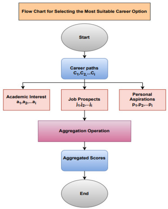 The most suitable career option based on the combined criteria of academic interest, job prospects, and personal aspirations is , as it has the highest aggregated score. This method empowers the students to make well-informed career decisions that align with their individual preferences and uncertainties, ultimately leading to a more satisfying and fulfilling professional path. Figure 4 shows the complete steps of how our algorithm finds the highest aggregated score.