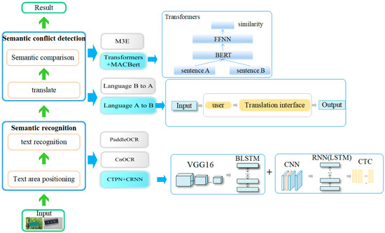 A tampering detection model for bilingual scene images with textual content was developed, based on the framework outlined in Section 3.1 and taking into account the unique characteristics of such images. The model was comprised of two main components: semantic recognition and semantic conflict detection, as illustrated in Figure 3.