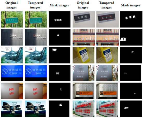 The BSTID (Bilingual Scene Text Image Dataset) that was utilized in this experiment was constructed based on three datasets: BiTCSD [28], Total-Text [29], and MSRA-TD500 [30]. Suitable bilingual scene images with textual content, featuring billboards, street signs, and other elements in Chinese, English, Japanese, Korean, and other languages, were meticulously selected from these datasets. A total of 1700 images were gathered, which comprised original images, tampered images, and tampered images that had undergone secondary editing. After having undergone a series of preprocessing steps, these images were formed into the BSTID that was used in this experiment. Below is an introduction to the three key datasets.