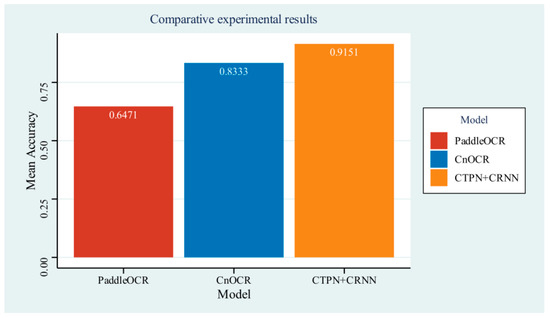 As illustrated in Figure 10, the performance of PaddleOCR in the experiment was moderate, achieving an average accuracy of 0.6471. CnOCR was demonstrated to have good performance in detection, with an average accuracy of 0.8333. However, the combination of the CTPN and CRNN algorithms was found to outperform both, achieving an average accuracy of 0.9151. Additionally, the accuracies of both the PaddleOCR and CnOCR models fluctuated during the experiment, whereas the combination of CTPN and CRNN algorithms demonstrated greater stability. Notably, in test samples containing numerous text and punctuation, PaddleOCR performed exceptionally well, with an average accuracy of 0.9474, whereas the CnOCR model only achieved 0.1810 in the same samples.
