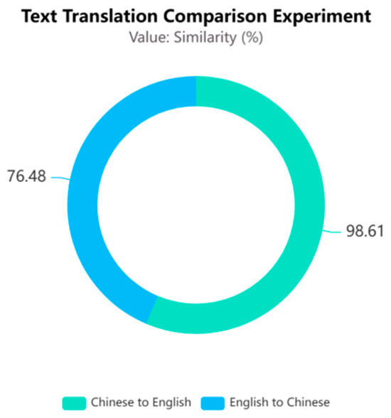 Under the same experimental conditions illustrated in Figure 11, the translation of English text into Chinese resulted in a semantic similarity score of only 76.48% for the text pairs, indicating poor performance in terms of semantic similarity in the Chinese context. In contrast, when Chinese text was translated into English, the semantic similarity of the same set of test samples significantly increased to 98.61% when constructing English text pairs. This outcome suggests that different language environments indeed impact the assessment of linguistic similarity. The semantic richness of Chinese may have contributed to increased difficulty during the translation process, leading to a decrease in semantic similarity. Conversely, the more direct expression of English facilitated the maintenance of semantic consistency across translations, thereby significantly enhancing semantic similarity.