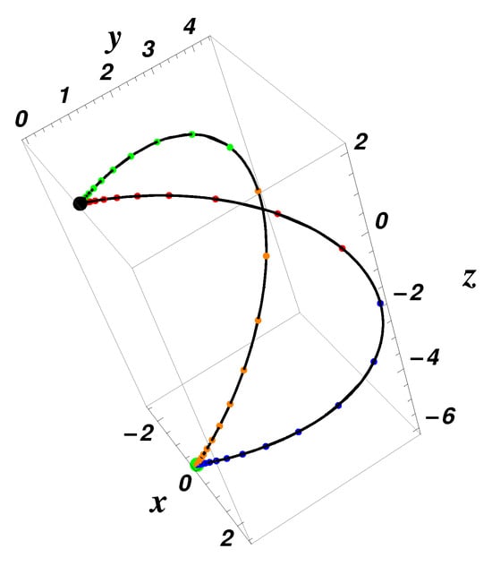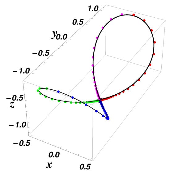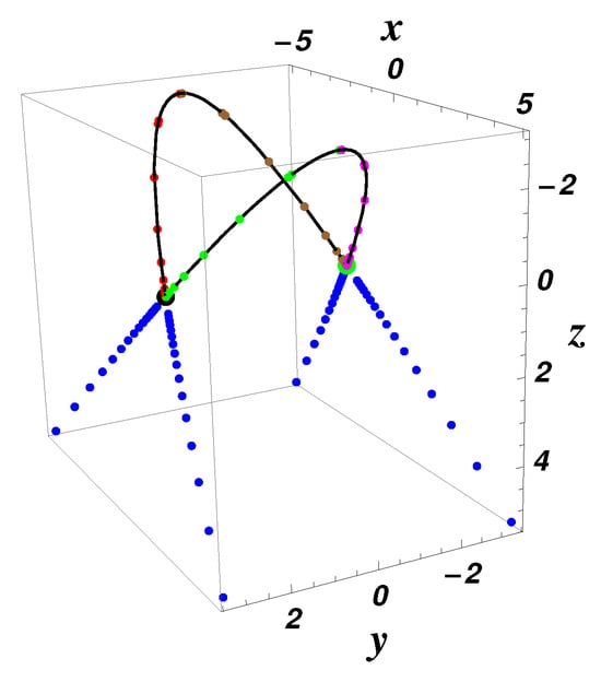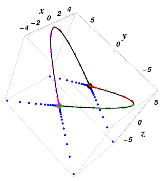 Equilibrium points (black point) and (green point); the heteroclinic orbits (red), (green), (brown), (magenta); and the split-heteroclinic orbits , , , (blue), using Equations (16) and (17) for , , , , , ; initial data: , , —exact solution (dotted color curve) and numerical results (solid black curve), respectively.