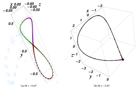 By means of these prime integrals (constants of motion), the semi-analytical solutions in closed-form could be obtained using the OAFM procedure [23]. This solution will be called the OAFM-solution and is denoted by or . The accuracy is validated in Section 4.2.