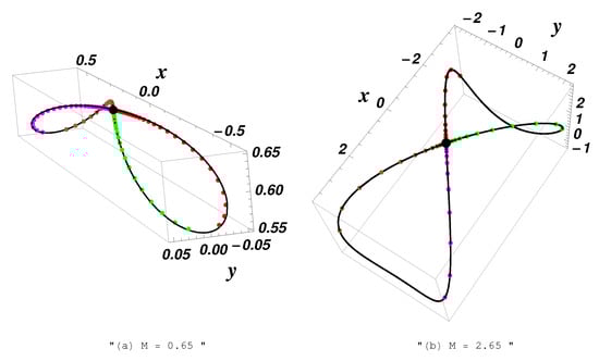 The performance of the OAFM-solutions and the states of the studied system, by comparison with the corresponding numerical ones, is qualitatively reflected by Figure 10, Figure 11, Figure 12, Figure 13, Figure 14, Figure 15, Figure 16 and Figure 17 for different physical parameter values. Figure 18 shows periodic orbit for , , , , and .