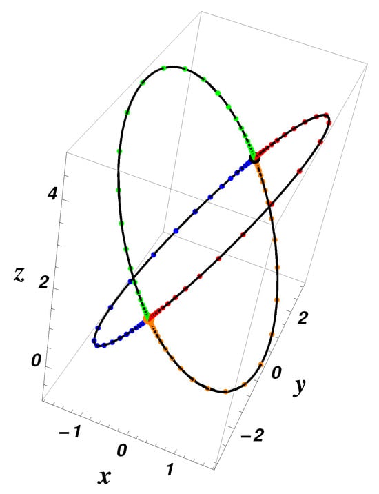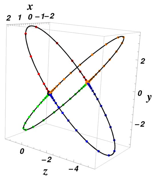 Related to the equilibrium point , when , we assume that , , and . Then, . The periodic orbit does not exist, but there exist eight heteroclinic orbits given by the intersection between the level sets and as follows: