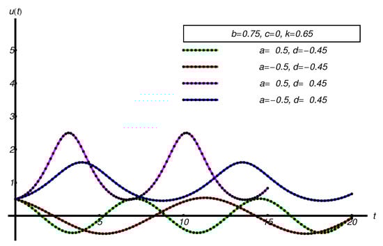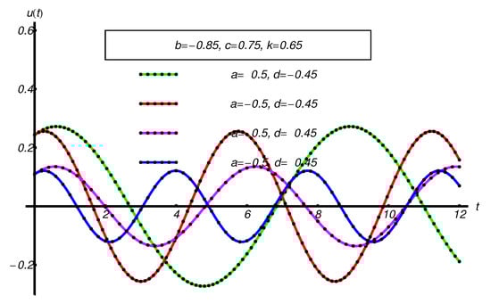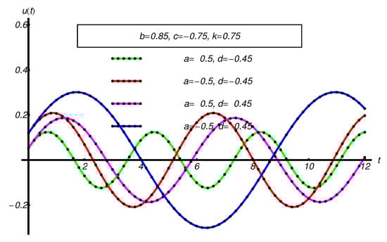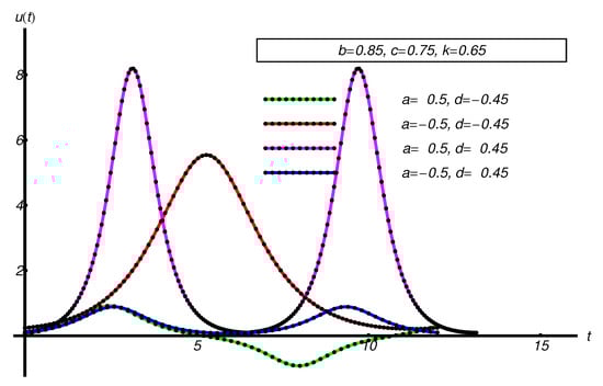 - The non-existence of small parameters: The OAFM-solutions are built for arbitrary values for the physical parameters a, b, c, d, k, namely, for in all subcases , , and , respectively; A special case when is analytically investigated. The OAFM-solution is obtained in the same manner.
