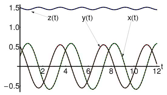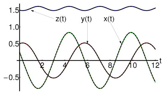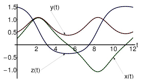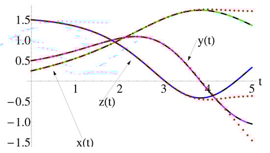 Performance of the approximate solutions , , of Equation (1) using Equation (A1) (dashing black curves), compared with the iterative solutions , , using Equation (104) (dotted red curves) and the corresponding numerical ones (solid color curves: green for , magenta for , blue for ), respectively.