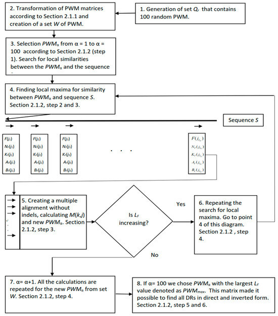 Step 1. To find DRs in the bacterial genome sequence denoted as S, we started with the first matrix from set W, which was denoted as PWMα (α = 1). Then, for each base number j in sequence S (starting with j = 1), we calculated V(j + h) as follows: