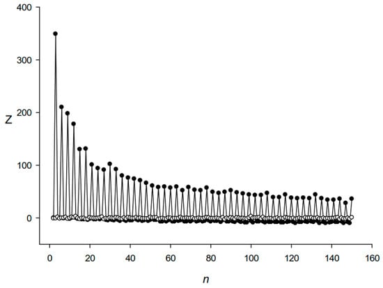 The argument of the normal distribution Z for the DR sequences from the E. coli genome for different period lengths n. Black and white circles show Z(n) values for DRs and for the same number of random sequences taken as set Q (Section 2.2), respectively.