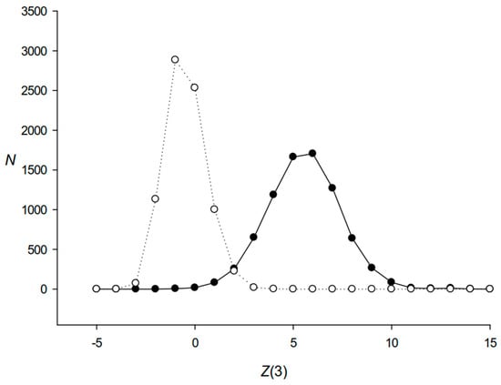 To determine the distribution of statistical significance of triplet periodicity for the found DRs, we calculated I(k) for each matrix Mk (n,4) and n = 3 for all DRs using Formula (4) (k varied from 1 to 7873). 2I(k) had approximately χ2 distribution with 6 degrees of freedom [21]. Then, we computed the argument of normal distribution Z(3) for each sequence k as (4I(k))0.5 − (11.0)0.5. The distribution of Z(3) for all found DRs is shown in Figure 3. We counted the number of repeats N(i) that had Z(3) for the intervals from i to i + 1. The results indicated that most DRs had clear triplet periodicity.
