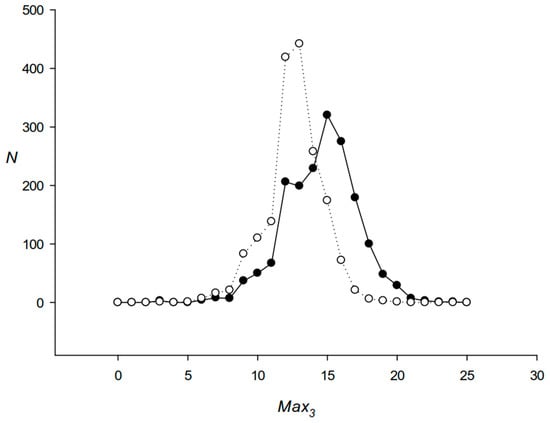 Distribution of the Max3 sum for S12 sequences. Black and white circles show the distribution of Max3 for the original S12 and randomly shuffled S12, respectively.