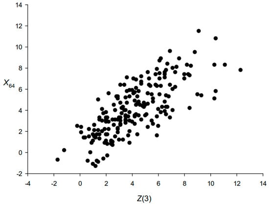 The relationship between Z(3) and X64 calculated on a set of sequences of length L = 600 bases randomly selected from the E.coli genome. For each fragment, we calculated the frequencies of triplets f(i), i = 1, 2, …, 64, as well as the frequencies of bases d(j), j = 1, 2, 3, 4. The triplets were calculated without overlapping each other. Here, 1, 2, 3, and 4 correspond to the bases A, T, C, and G. Then, the probabilities p(j) = d(j)/L and the theoretical probabilities of triplets t(i) = Np(j)p(k)p(l) were calculated, where j, k, and l are equal to 1, 2, 3, or 4 independently of each other, and N = L/3. After this, X(i) = (f(i) − Nt(i))/(Nt(i)(1 − t(i)), i = 1, 2, …, 64, were calculated, as well as X64 = (2χ2)0.5 − (126)0.5. Z(3) was calculated as in Figure 3, Section 3.1.