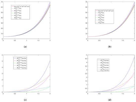 Now, let us return our attention to the test function to verify our claim numerically. Firstly, we present the convergence of operators for different values of . From Figure 1, one can see the convergence of operators (Figure 1a) and (Figure 1b) for . Moreover, Figure 1c,d shows the corresponding plots for the magnitude of differences. From the above graphs, we conclude that the estimation error of the operators decreases from to , after which it starts to increase. Therefore, the best approximation by the operators happens at .
