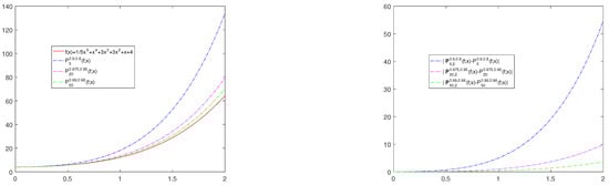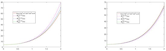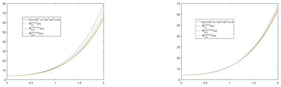 Next, in Figure 2, one can see the convergence of operator for fixed values for parameters p, q, and and for different values of n. We observe that the introduced operator converges better to the test function as parameter n increases. In Figure 3, we show the convergence of operators defined in (10) to the function for , , (Figure 3a), (Figure 3b) and . It is obvious from Figure 2 and Figure 3 that the larger the n value, the better the approximation.