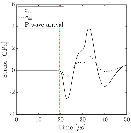 The set of differential equations was solved in Julia [20] using the finite difference discretization scheme MethodOfLines [21] and an adaptive Adams-Bashforth method VCAB5 for a time duration of 50 µs. Figure 2 shows an example stress profile against time for a radial location of away from the blast wave source, with compressive stresses being negative and tensile stresses being positive. From mass and momentum conservation principles, the axisymmetric stress wave attenuates through the medium as it propagates radially, but the wavefront propagates at the same velocity . Upon arrival of the P-wave wavefront, both radial stress and hoop stress are initially in compression (negative) before becoming tensile (positive). According to the Griffith theory of fracture, brittle cracks evolve and propagate in a direction perpendicular to the direction of maximum tensile principal stress. As such, when the magnitude of the tensile strain is sufficiently large, tensile cracks begin to initiate within the tensile region and propagate radially from the blast source (Figure 3) [22,23].