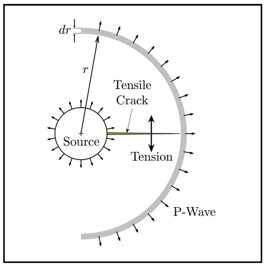 and and are the material’s Young’s modulus and Poisson’s ratio, respectively. In Equation (1), is the P-wave (or dilatational wave) velocity in the material. After the initiation of the blast, this P-wave is the fastest traveling wave that transmits energy through the surrounding medium. For some arbitrary blast pressure wave profile, the P-wave and S-wave wavefronts propagate through the solid medium with velocity and , given, respectively, as