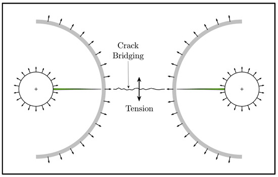 As the axisymmetric P-waves propagate toward each other (at velocity ), the interaction results in a superposition of stress states along the bisecting midpoint between the two sources. Along the spacing direction, the compressive stresses at the wavefronts act diametrically opposed to each other. Along the burden axis, however, superposition of the hoop stresses results in tensile stresses acting away from each other (Figure 4). Therefore, the brittle cracks tend to propagate preferentially along the spacing axis due to the maximum principal tensile stresses acting perpendicularly along the burden directions. These cracks typically bridge across two adjacent blast holes (Figure 5a) [4,9]. Along the burden axis, , and for two sources with the same strength , and so the stress wave superposition reduces Equation (14) to .