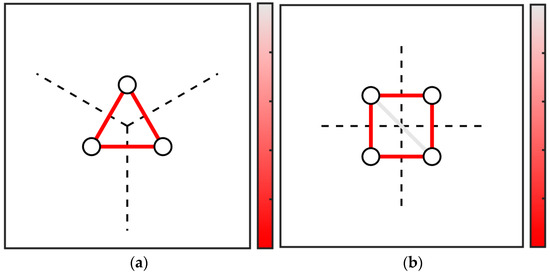 In Figure 7, the Voronoi tessellation and Delaunay triangulation graphs are plotted together for a regularly spaced three and four blasthole source locations as given in the previous section. The dashed Voronoi lines indicate the location and axes of peak tensile stresses. The shortest distance between each blasthole is 120 mm, and these distances are shown in red in the Delaunay triangulation diagram as they are the most likely locations for crack bridging. In Figure 7b, the diagonal (indicated in gray) is less likely to bridge as the distance is much further compared to the edges of the square.