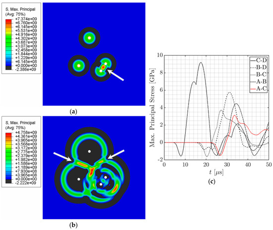 Abaqus/Explicit simulation of simplified isotropic homogeneous rock model at (a) 14.2 µs and (b) 35.9 µs. Location of maximum principal stresses (denoted by arrows) correspond to the dashed Delaunay triangulation lines in Figure 8. Time history of maximum principal stress at midpoint locations between respective source locations (c) shows that the arrival of the maximum principal stresses (i.e., arrival of the P-waves at the midpoint) correspond to the predicted times of arrival given in Figure 8.