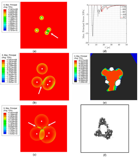 Abaqus/Explicit simulation of blast wave interaction in granite at (a) 4.9 μs; (b) 10.3 μs; and (c) 14.3 μs after blast initiation. The green zones indicate maximum principal stresses due to stress wave interaction, highlighted by white arrows; (d) time history of maximum principal stress showing largely compressive stresses during stress wave interactions; (e) map of maximum principal tensile stresses at 75 μs after blast initiation acting along Voronoi tessellation lines predicted in Figure 8; (f) Abaqus/Explicit simulation of blast wave interaction causing crack initiation and propagation. Dark zones indicate failed elements in the simulation, and the location and direction of crack bridging corresponds to the red Delaunay triangulation lines in Figure 8.