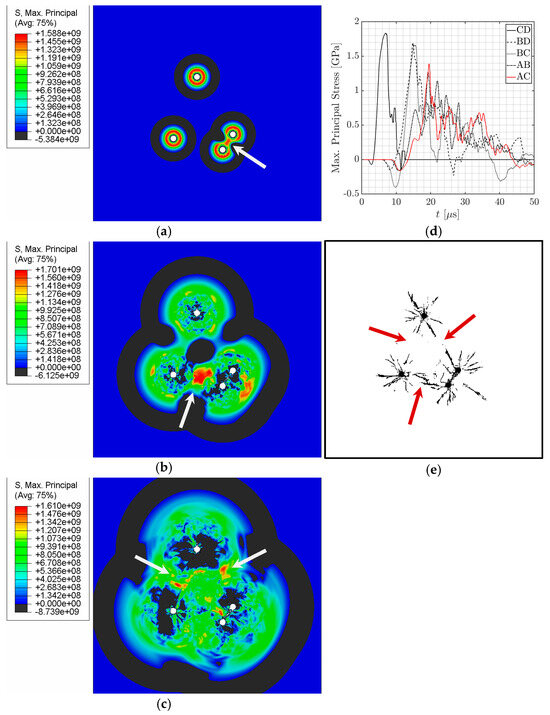 Abaqus/Explicit simulation results for fracture pattern and crack bridging in silicon carbide at (a) 5.3 µs, (b) 14.7 µs, and (c) 21.6 µs. The red zones indicate maximum principal tensile stresses due to stress wave interaction, highlighted by white arrows; (d) the time history of principal stresses at the midpoints show extremely large tensile stresses after the small initial compressive wave; (e) Abaqus/Explicit simulation of blast wave interaction shows crack initiation and bridging. Dark zones indicate failed elements in the simulation, and the location and direction of crack bridging corresponds to the red Delaunay triangulation lines in Figure 8. Partial onset of bridging between points A-B, A-C, and B-D are observed (red arrows).