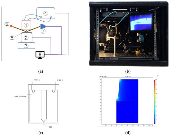 (a) NSMM schematic diagram. ① λ/4 coaxial resonant cavity with an extend probe, ② X−Y−Z motorized platform, ③anti−vibration base, ④ VNA, ⑤ the sample, ⑥ light source, ⑦ CCD camera, and ⑧ a laptop. (b) A real NSMM system. (c) NSMM probe. (d) The simulated field intensity distribution near the probe.