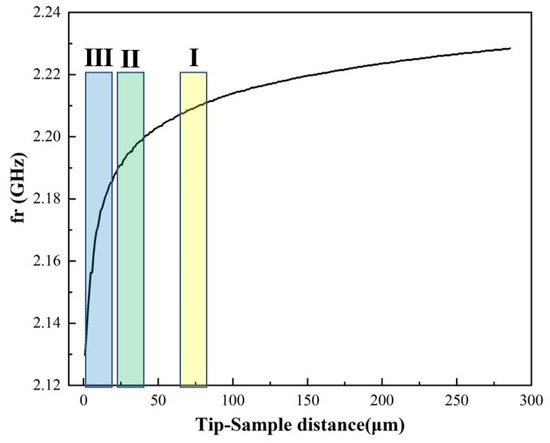 Figure 2 shows the relationship between the resonant frequency and probe–sample distance in an NSMM point scanning experiment. In this point-scanning experiment, the curve reflects the response between the probe and the sample, and the horizontal interval represents the distance change between the probe and the sample. The NSMM image can be obtained with higher quality when the probe–sample distance falls to the rapidly growing part, and the mapping shows lower quality when this distance falls to the approximately linear part. Three intervals with equal ranges are marked with different colors on the curve in Figure 2. The experimental distance between the probe and the sample in region I (yellow, 65 < z < 85 µm) can strictly obey the requirement for non-destructive testing. However, the tip–sample distance in region II (green, 25 < z < 45 µm) and region III (blue, 0 < z < 20 µm) were expected to be greater in the near-field microwave testing. Higher quality for NSMM imaging can be obtained in these intervals of region II and region III. The application for NSMM is greatly expanded by drawing distinct images in region II or region III. All needed data can be obtained by non-destructive microwave testing. (e.g., in region I).