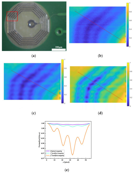 (a) Optical image of an octagonal inductance on a print circuit board; (b) NSMM imaging; (c) the first modified method; (d) the second modified method; and (e) the line distribution of normalized resonant frequency along the red line in (b–d).