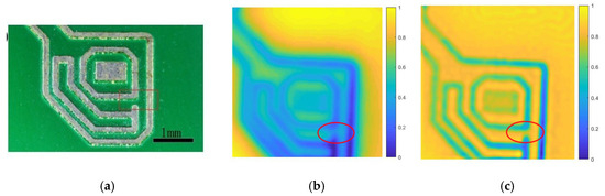 (a) Photo of a defective PCB; (b) raw NSMM imaging; and (c) second-order-modified NSMM imaging. The defect on the PCB is marked with red circles.