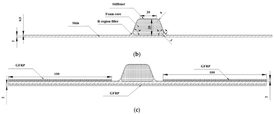33]. Zero-thickness cohesive elements were inserted between all connected components. In this study, SR4 elements were used for modeling the stiffener and skin, C3D8R solid elements were used for modeling the foam core and R-region filler, and COH3D8 cohesive elements based on the traction-separation model were used to simulate the interfaces between the stiffener and skin, and between the foam core and R-region filler. The hat-shaped stiffener was filled with a foam core, and the bottom of the foam core was filled with R-region filler. A “tie” binding connection was used between different components. The interface parameters are shown in