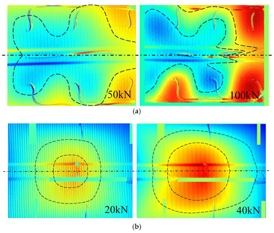 38]. The reason is that the stiffener is the main load-bearing structure in the stiffened panel, leading to its high sensitivity to damage. (2) There is often a significant difference in stiffness between the stiffener and the skin panel, and the bonding area between them is more prone to material damage and delamination. (3) The damage distribution of both SFHCP specimens is almost concentrated in the first five layers and the last five layers, with minimal damage in the middle eight layers, indicating that the material utilization rate of this stiffened panel is not high when used as a pressure-bearing structure and further optimization of the design is possible.