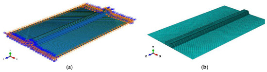 When meshing the model, considering the accuracy of the numerical simulation results and the size of the computational scale, the dimensions in the FEM are the same as those of the actual SFHCP specimens. The overall mesh of the model is uniformly divided, with a mesh size of 5 mm for the skin panel and hat stiffener, resulting in 19,646 elements and 43,508 nodes. The foam core has a mesh size of 3 mm, and there are slight variations in mesh size at the corners of the stiffener, resulting in 167,340 elements and 199,948 nodes. The impact of finite element meshing of the SFHCP specimen is shown in