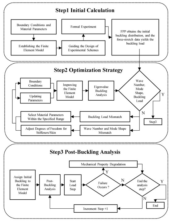 Step 3, the matched buckling mode is introduced into the improved FEM in the form of initial geometric imperfections, and then post-buckling analysis is carried out. In the post-buckling analysis, material stiffness degradation and geometric nonlinearity are considered. Incremental loading is used, and the laminated material parameters are read to calculate the stiffness matrix, stress, and strain. The failure criteria are applied to determine whether a failure occurs. If failure occurs, the stiffness matrix is degraded and the stress is updated; if not, the load is increased, and the same process is repeated until the structure loses its load-bearing capacity, at which point the analysis is considered complete.