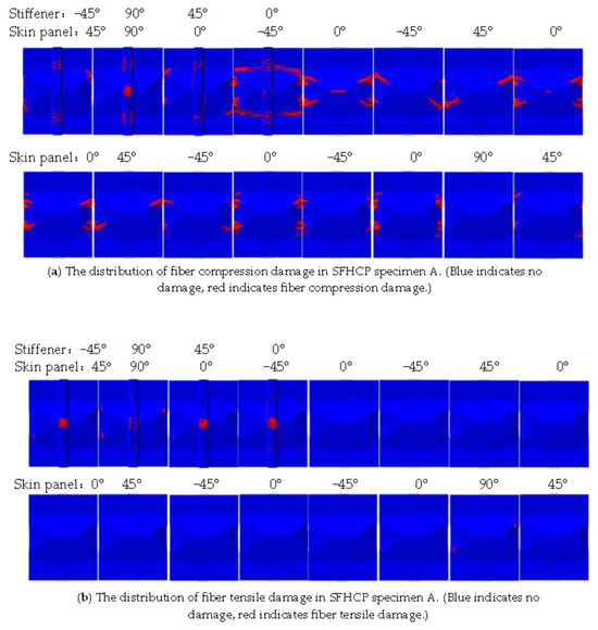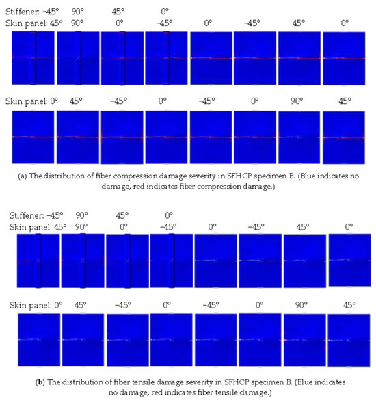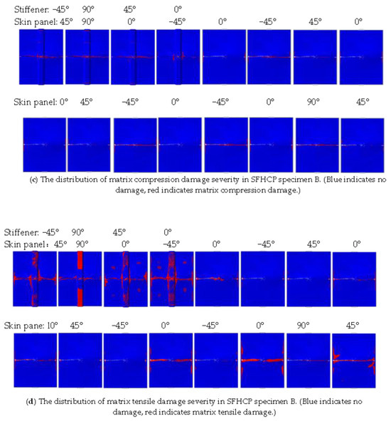 Figure 12, the damage area of this SFHCP specimen is relatively small. These damage areas are mainly concentrated near the transverse central axes of each layer and the flanges of each layer of the panel, and the damage areas are symmetrically distributed relative to the two horizontal and vertical central axes. The symmetry of the damaged regions in the figure is not only determined by the symmetric stacking sequence and buckling mode of the specimen but also influenced by the distribution of low-velocity impact damage. As a result, the symmetry in the distribution of matrix tensile damage in specimen B is less pronounced. Since specimen B underwent direct bending failure during compression with minimal buckling, the interlayer damage was mainly concentrated along both sides of the central line of the stiffened plate. Additionally, as the fixture no longer constrained buckling at the boundaries, the damage distribution at the boundaries was significantly smaller compared to specimen A. The main damage form of the skin is matrix tension damage, while the main damage forms of the stiffener are matrix tension damage and matrix compression damage. Overall, the damaged area of specimen B is relatively small, with a large portion of the material remaining intact despite the specimen’s failure. This not only results in material waste but also leads to a lower load-bearing capacity. These findings indicate that specimen B exhibits extremely high impact damage sensitivity in the central region of the stiffeners on the foam core side.