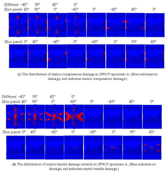 Figure 11, the damage areas are mainly concentrated on the first four layers of the skin and stiffener, which are integrated, and on the flanges of each layer of the panel, and the damage areas are relatively symmetrically distributed with respect to the two horizontal and vertical central axes. In the figure, the symmetry of the damaged regions is determined by the specimen’s symmetric stacking sequence and buckling mode. Moreover, interlayer damage tends to occur in areas with severe buckling, such as within the stiffeners and the panel. In contrast, the densely distributed damage along the boundaries is caused by the combined effects of composite material boundary phenomena and the strong constraint forces that suppress out-of-plane displacement (buckling). The main damage forms of the skin are matrix compression damage and fiber compression damage, while the stiffener has all four types of damage. Since specimen A did not undergo any impact, it incurred no initial damage, and the damage observed during the compression failure process was predominantly progressive in nature.