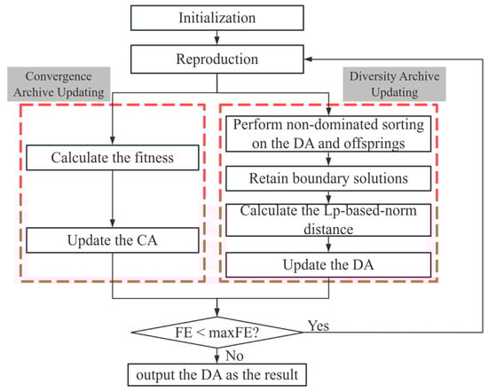 The flowchart of TwoArch2 is shown in Figure 1, whose distinguishing character is utilizing two archives to maintain separate evolving flows after population reproduction. The two archives, namely the convergence archive (CA) and the diversity archive (DA), are updated according to distinct rules tailored to their specific purposes. During CA updating, the quality indicator Iε+ is adopted [13], which provides strong evolving pressure to help solutions approaching to the true Pareto front and prevents premature convergence to local regions of the PF. During DA updating, the Pareto dominance and maximum solution distance are jointly used to preserve the population diversity. Thus, the CA focuses on rapidly guiding the population towards the PF, while the DA aims to enhance diversity in a high-dimensional objective space. In each iteration, the population is reproduced by crossover and mutation operations. Subsequently, the CA and DA are updated, and the stopping criterion is checked. If the criterion is met, the DA is the output as the final result, which avoids the problem of how the convergence archive and the diversity archive partially overlap due to the use of the same offspring for updating the two archives.
