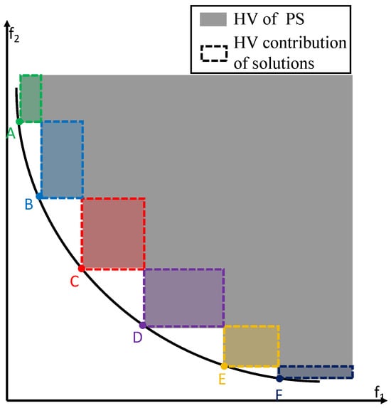 In order to solve the problem of using Pareto non-dominated solutions to update the output solution set, this paper uses a comprehensive index to update the output archive. Hypervolume is a widely used performance metric that simultaneously measures both the diversity and convergence of the population. However, the computation process of HV is time-consuming and difficult due to it needing to compute the volume of the hypercube composed between the solution set and the reference point set. To reduce the computational burden of hypervolume, the HV contribution method was proposed [42]. The main idea is to calculate the HV proportion provided by a certain solution in the Pareto set. By calculating the HV contribution of each offspring solution to the current Pareto set, a new population that maximizes the hypervolume under a fixed number of solutions can be quickly identified. The concepts of HV and HV contributions are illustrated in Figure 2.