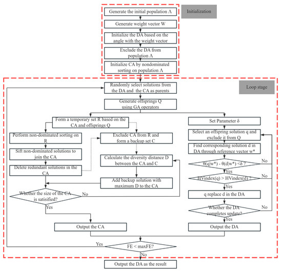 The main framework of TwoArchRH consists of initialization and loop components. In the initialization stage, a population Λ containing 3N individuals, randomly generated within the decision space, is initialized. Next, a set of N uniformly distributed reference vectors is predefined according to the method mentioned in [43]. The neighborhood relationship between vectors is recorded into a list for subsequent use. The angles between each reference vector and each initial individual solution are calculated according to Equation (3).