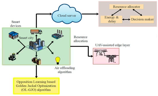 Modern computation techniques offer an optimal solution, which permits storage and computational resources to be placed nearer to the IoT system. The emergence of edge computing in Unmanned Aerial Vehicles (UAVs) acts as a fundamental framework in IoT, which helps to diminish delay between the IoT system and the edge [,]. Although UAV-based edge computing is an effective approach, it results in minor delays and minimal resource offloading [,]. Offloading resources in IoT environments requires numerous entities, such as Virtual Machines (VMs), to accomplish important tasks and perform VM distribution []. To rectify these issues, a distributed approach is utilized to forward the workload, which helps in balancing the usage of resources, and assists in attaining a superior management of resources [,]. Since distributed computing places resources nearer to the location of the model, it can be utilized in smart city applications [,,]. The edge servers are present in the middle layer of the IoT system, where they bridge a gap, and they also exist in the bottom layer [,]. The edge layer acts as a bridge to IoT devices but it has fewer resources than the cloud. Therefore, an effective approach is needed to provide a Quality of Service (QoS) in smart city applications []. This research puts forward a robust approach to examine the existing limitations while offloading tasks in the UAV-assisted edge layer. In UAV-assisted edge computing, optimized task scheduling is obtained by leveraging OL-GJO, a form of multi-joint symmetric optimization, to perform a symmetric searching process.