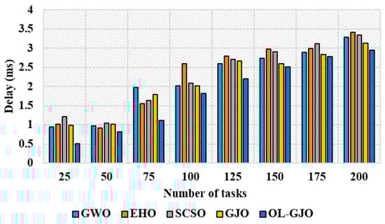 This sub-section presents results based on delays for different numbers of tasks and VMs. The evaluation takes place based on different task counts, ranging from 25 to 200. Table 3 presents the outcomes achieved while assessing OL-GJO with state-of-the-art algorithms. The graphical depiction of the delays of OL-GJO for various task counts is presented in Figure 3.